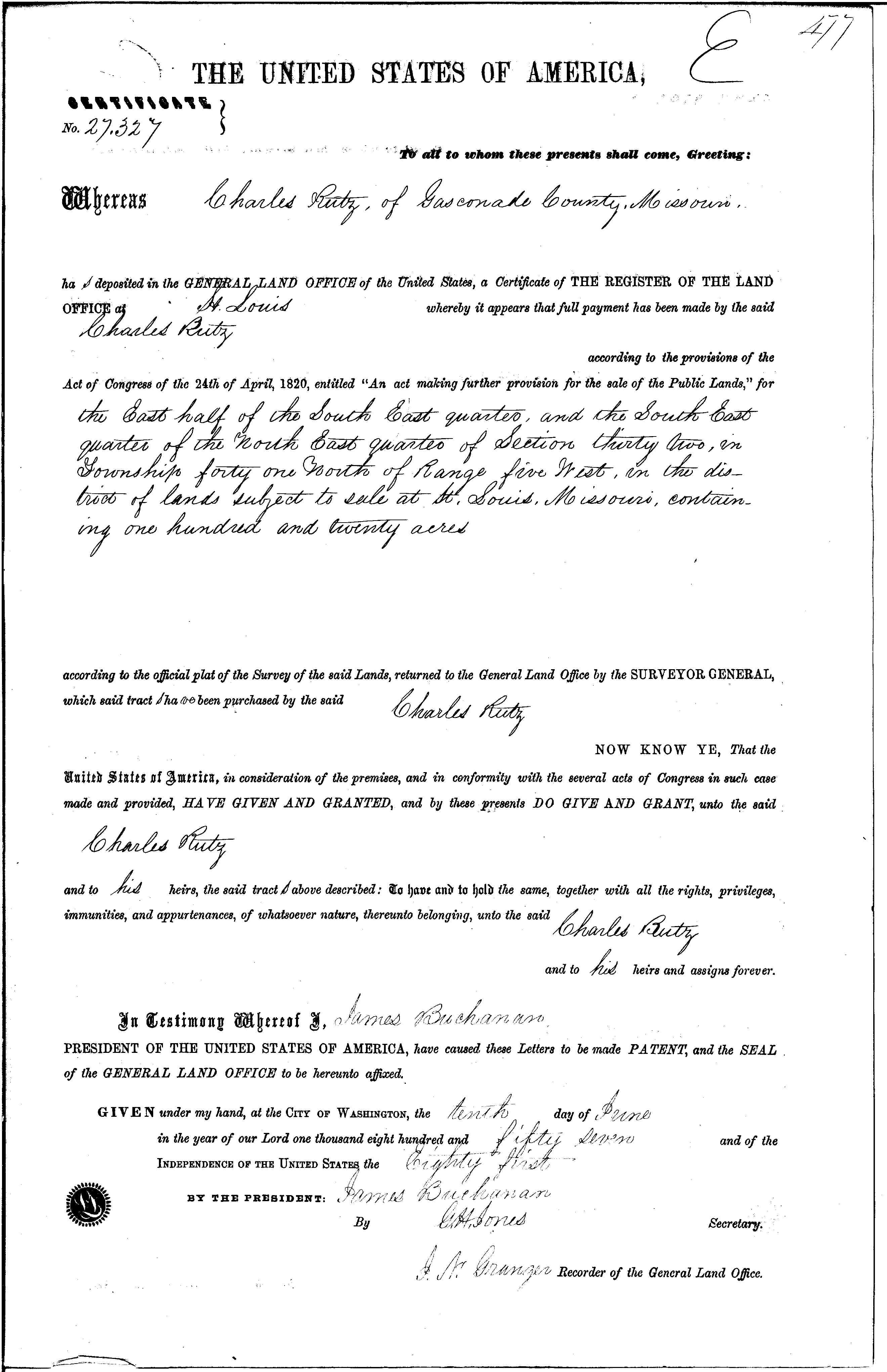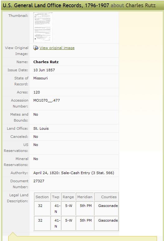 Charles Rutz's farm was located between Cuba Missouri and Owensville Missouri near Oak Hill (Crawford County, Brush Creek Township).